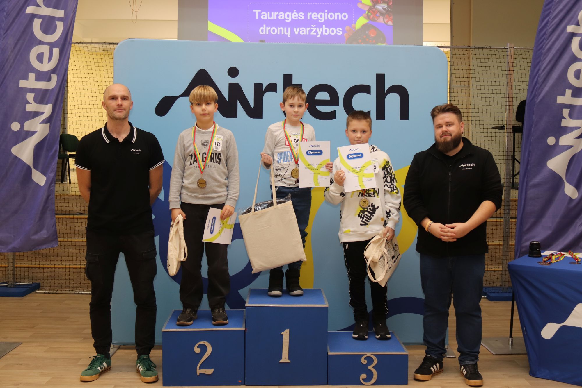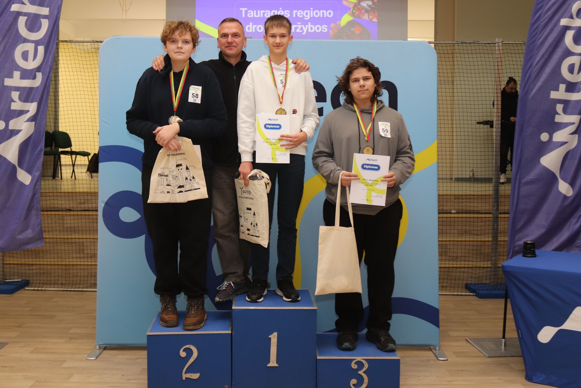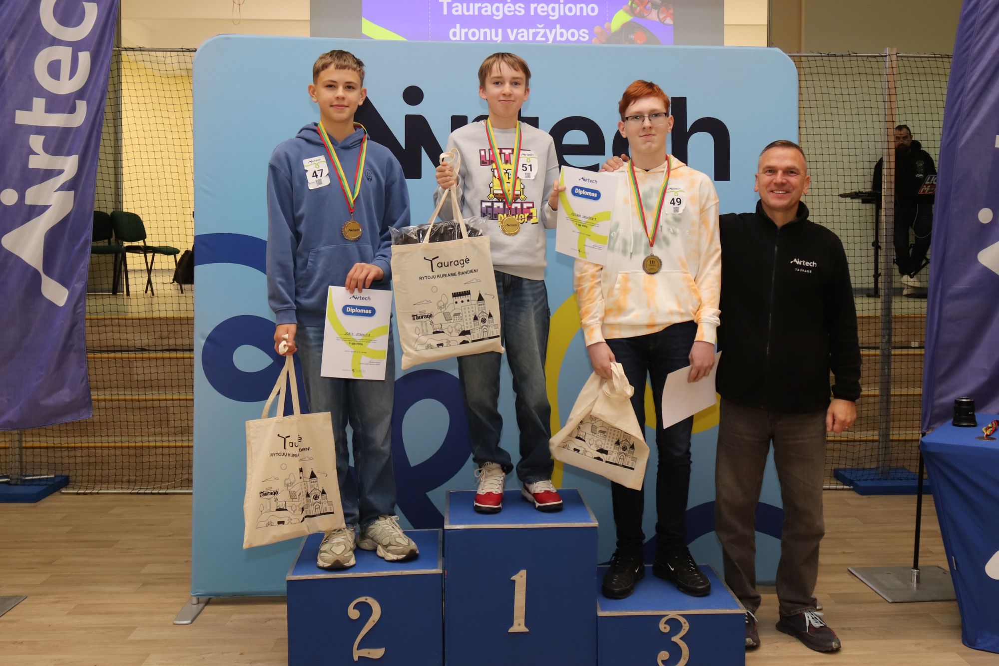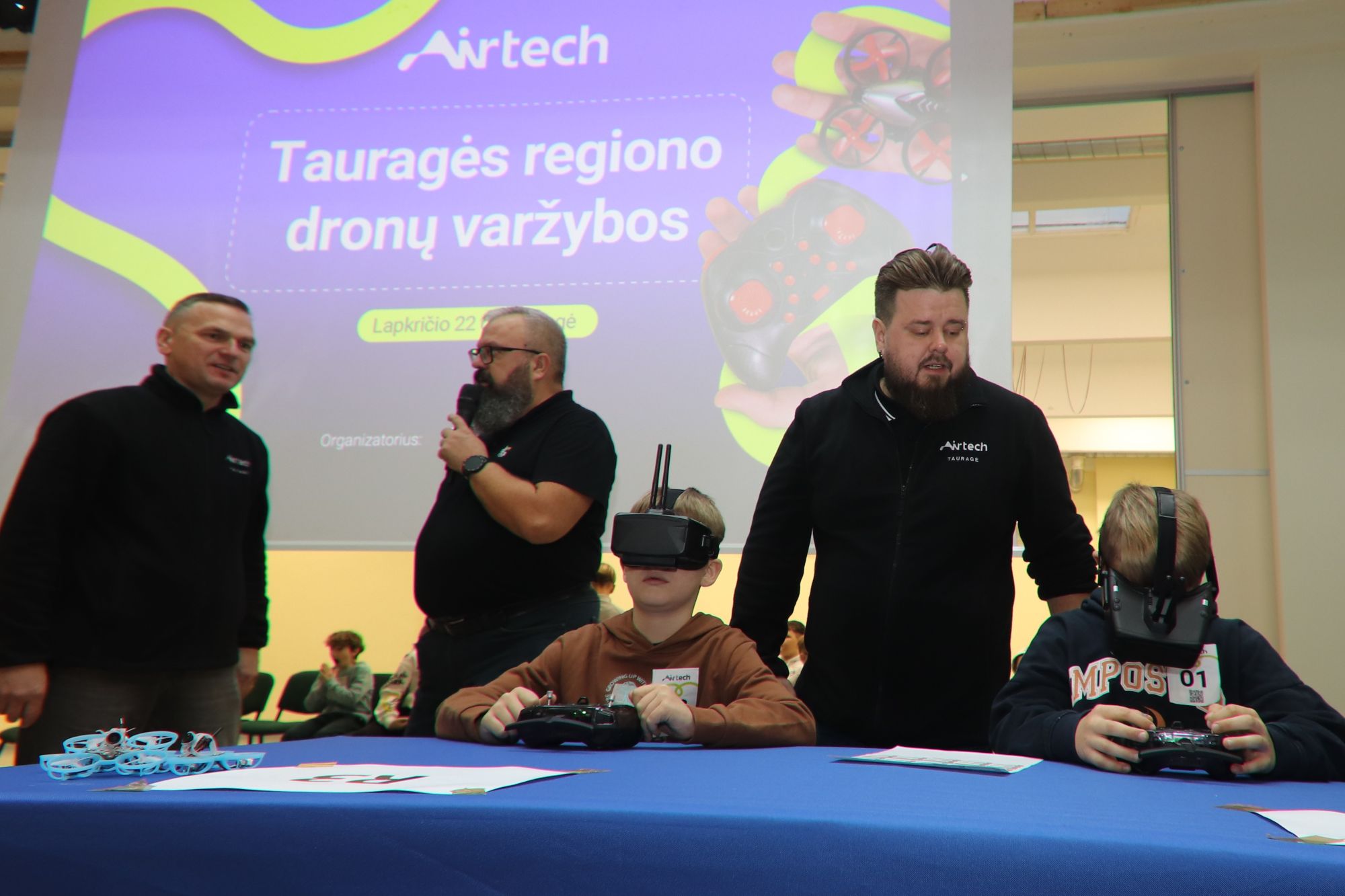 Tauragės regiono F9U klasės mikro dronų varžybose teisėjavo „Airtech“ neformaliojo švietimo mokytojai: Eimantas Laurinavičius, Osvaldas Jasenka, Simona Gaurienė ir Vitalij Gulbickij.
