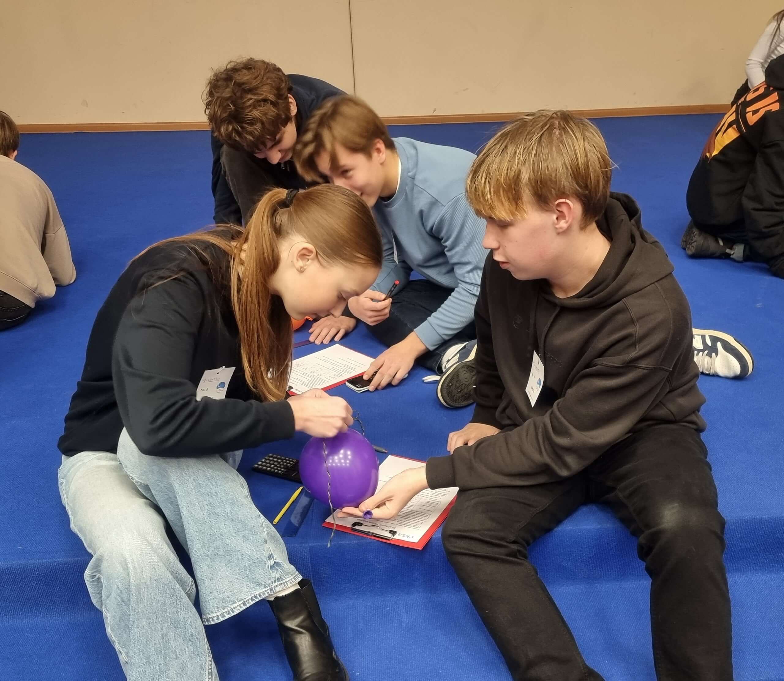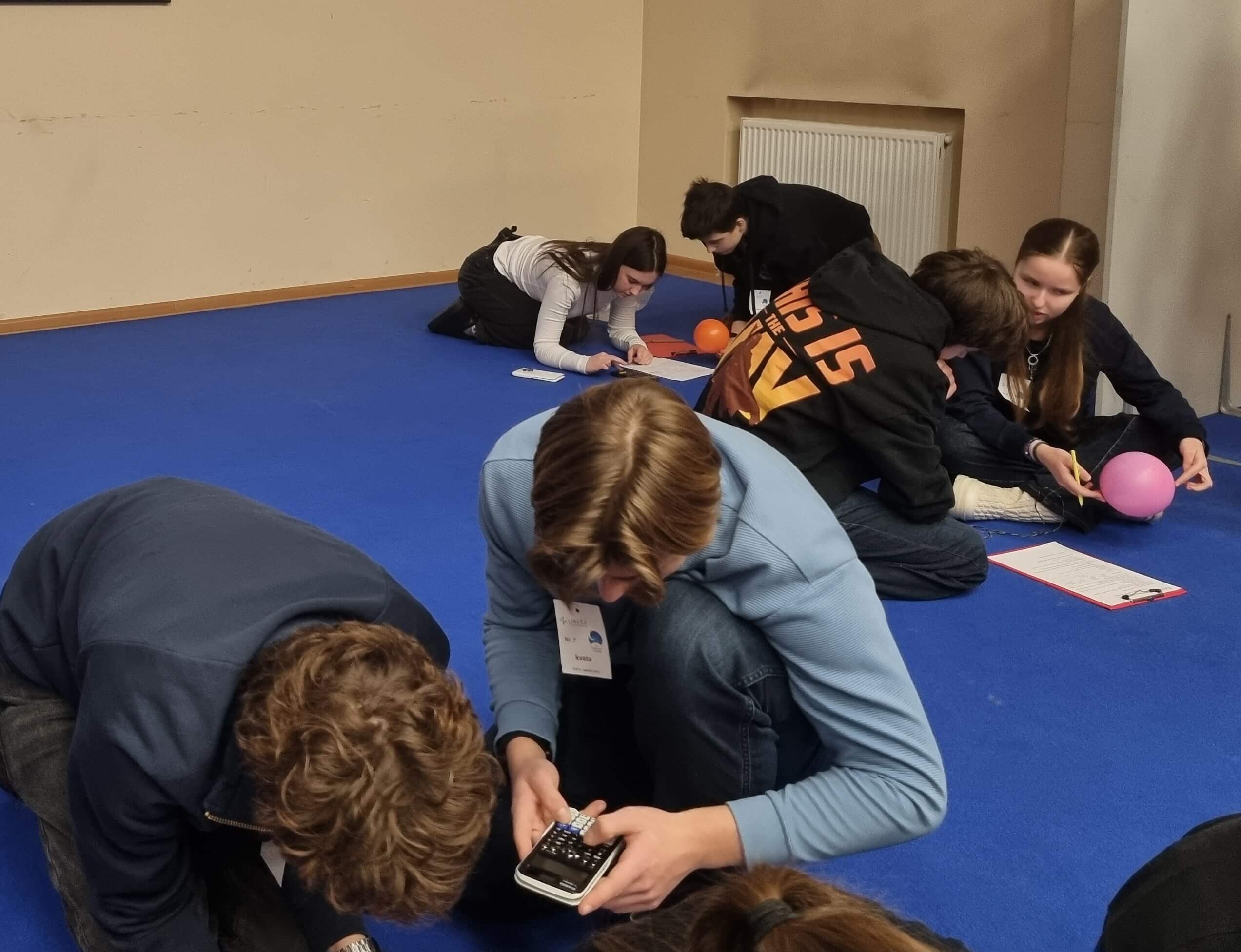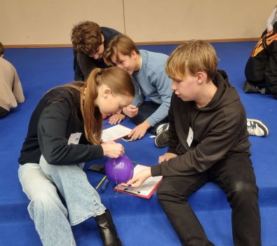 Atlikdami „Visatos baliono“ užduotį po 2 mokinius iš kiekvienos komandos turėjo ant nepripūsto baliono nupiešti ir pažymėti tris skirtingų tipų galaktikas, išmatuoti pradinius atstumus tarp jų, po to ant pripūsto baliono vėl išmatuoti tuos pačius atstumus, atlikti skaičiavimus bei aptarti gautus rezultatus atsakant į pateiktus klausimus. Tuo metu kiti komandų dalyviai sprendė kryžiažodį.