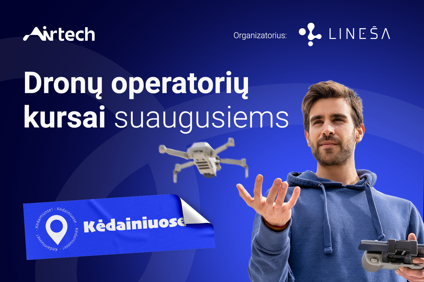 Lietuvos neformaliojo švietimo agentūros (LINEŠA) Airtech skyrius pristato naują FPV (First Person View) bepiločių orlaivių pilotavimo programą, skirtą suaugusiems. Kėdainiuose vyksiantys mokymai orientuoti į šiuolaikinių technologijų populiarinimą bei praktinių ir teorinių įgūdžių suteikimą tiems, kurie siekia pažinti dronų pasaulį iš arti.